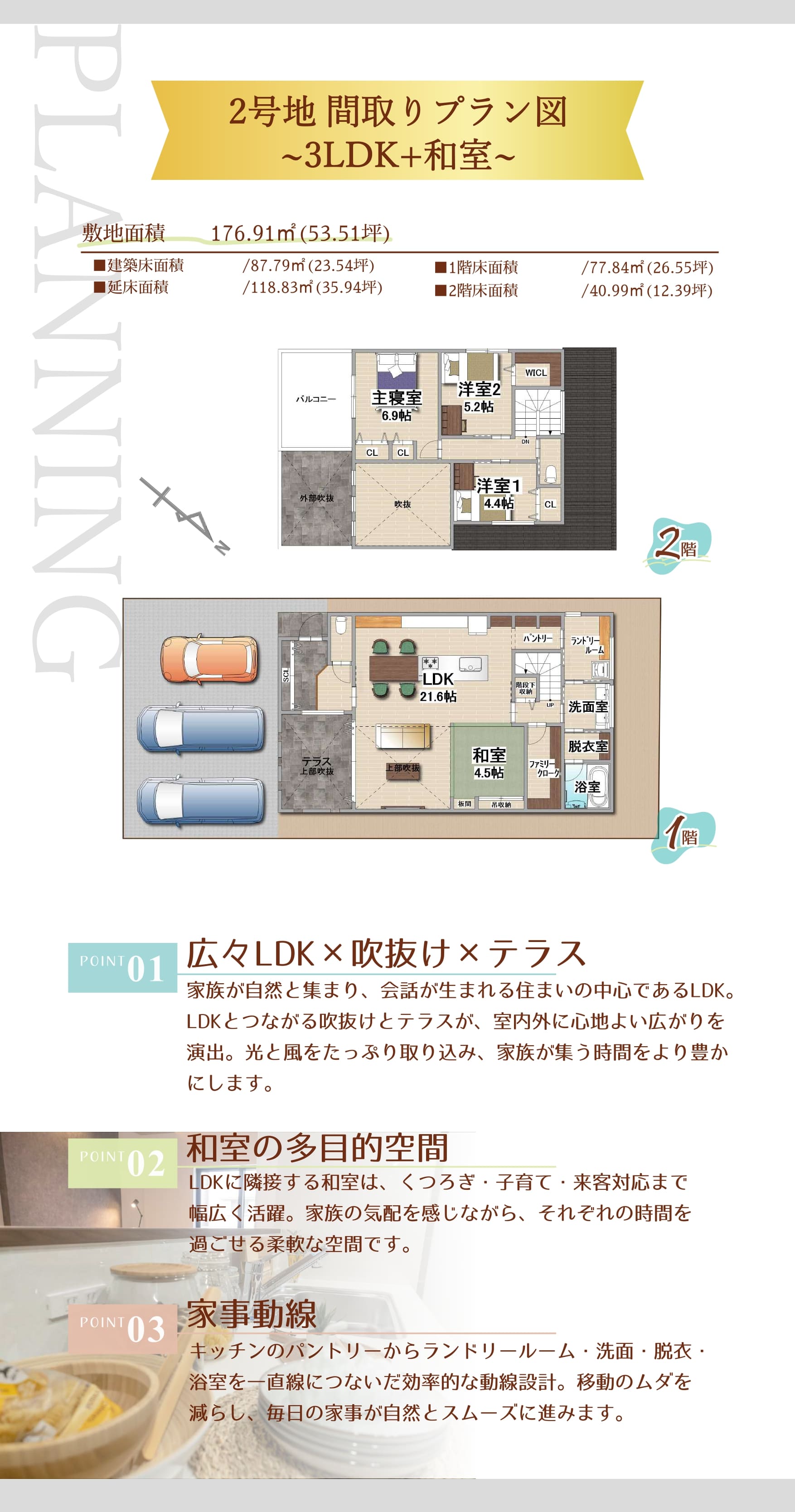 - 1号地 176.27㎡(53.32坪) 2号地 176.91㎡(53.51坪)